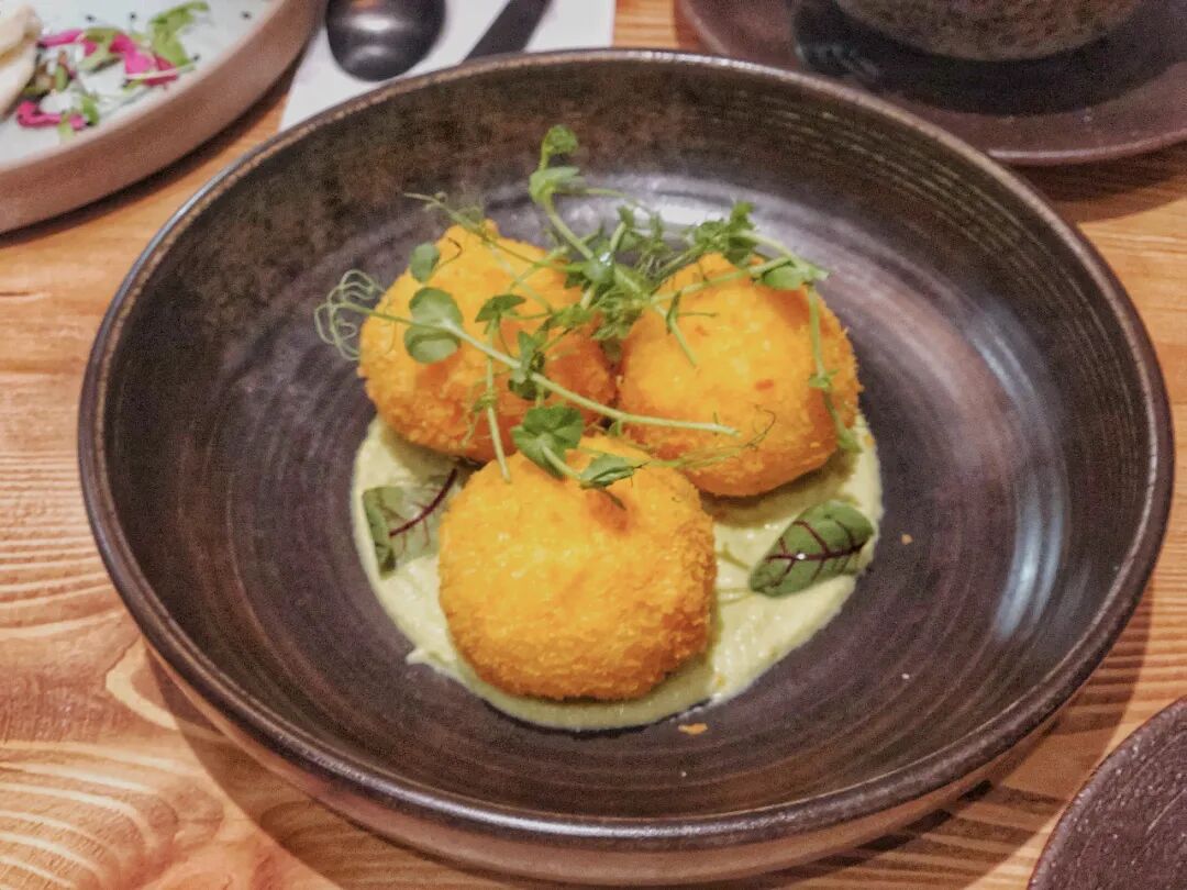 炸三鲜土豆球,土豆泥里包裹着秘制的酱料,裹上面包糠油锅里炸的酥脆,再配上制作的牛油果酱,也是很特别。