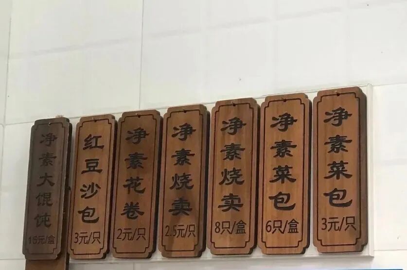 店里的产品一共就7种:净素菜包,净素烧卖,净素花卷,红豆沙包,净素大馄饨,马拉糕,枣泥卷。