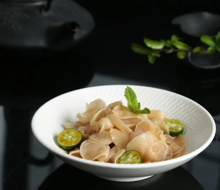 酸辣白玉木耳,金桔搭配泡椒作为酱汁,和脆脆的白玉木耳一起。