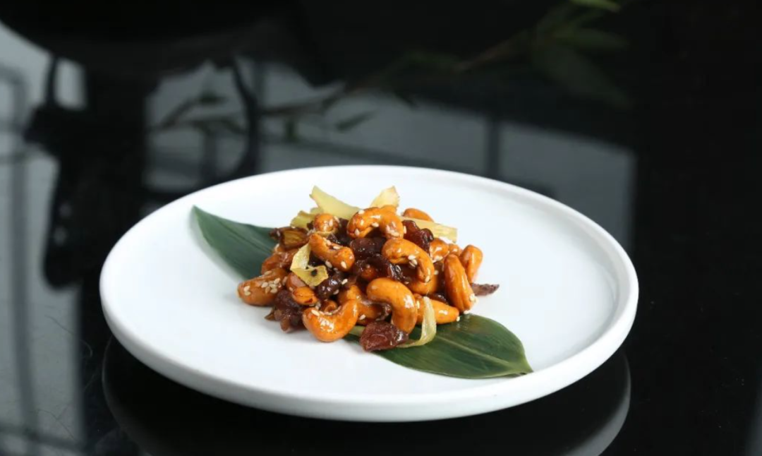 黄金菩提果,这道菜里有:腰果,桂圆,姜,芝麻。酸酸甜甜的口感,还具有滋补气血的作用。