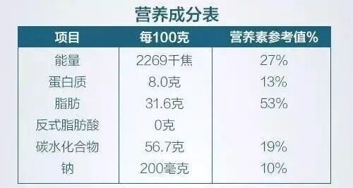 成人每日推荐脂肪摄入量为60g。这款甜品100g含有脂肪31.6g,占推荐摄入量NRV的53%,也就是说吃200g该食品,就够一个成年人每天的脂肪需求了。