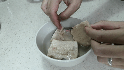1. 先将拉丝蛋白泡水后撕成碎条。