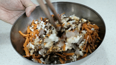 4. 所有馅料放入大碗中,顺时针搅拌,可以加入适量面粉。