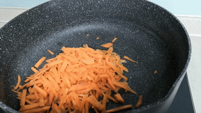 3. 胡萝卜切细丝,下锅加盐炒软。