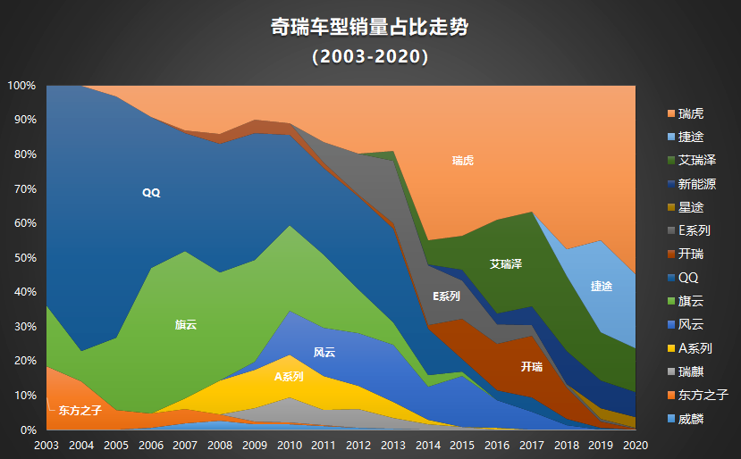 如今,奇瑞的销量主要由瑞虎、捷途等中型SUV贡献,艾瑞泽轿车和新能源汽车为两翼。