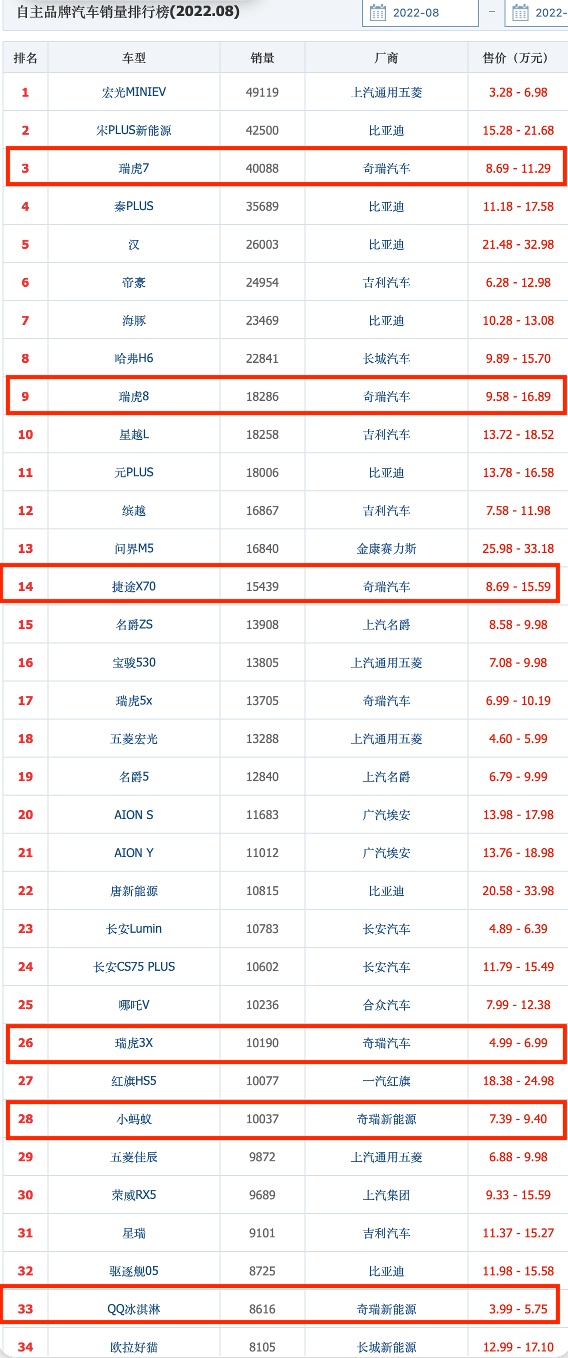 乘联会数据显示,奇瑞今年8月零售销量位居第十,前八月销量仅排在第14位,虽然增速不俗,但远没有其宣传的那般强势。
