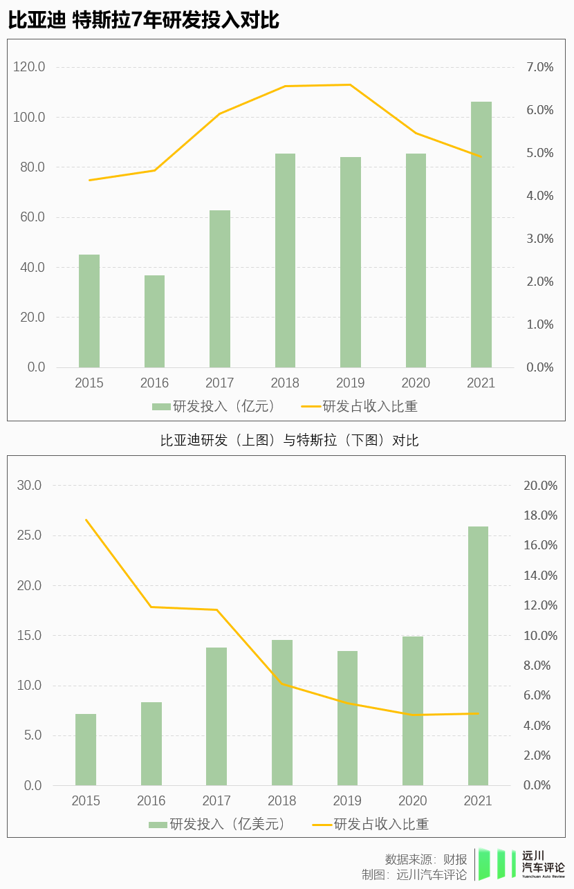 特斯拉与比亚迪是两家在研发上颇为高效的车企,过去7年,它们各自为研发投入了大约500亿元,换回了大量的自研技术,但选择的方向各有侧重。