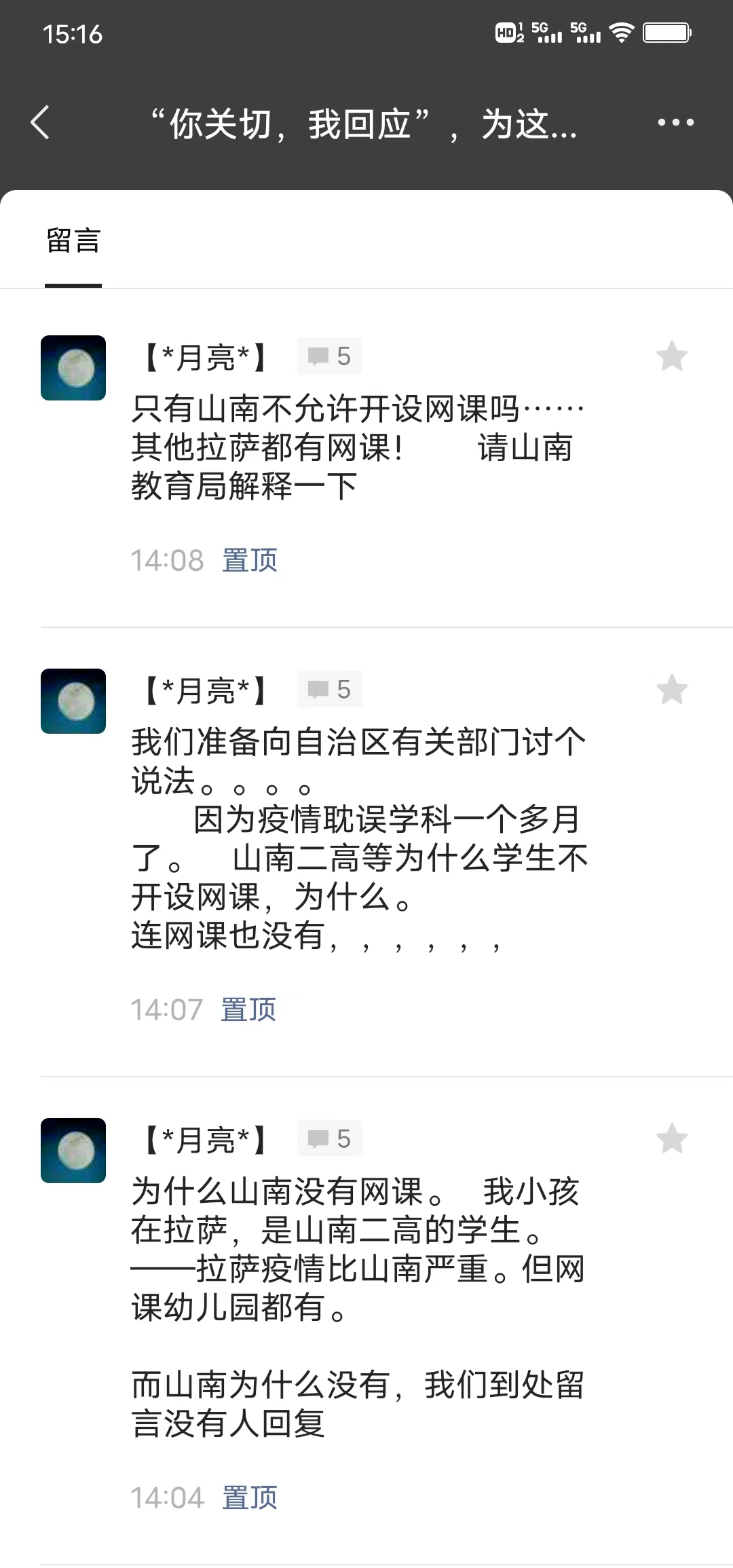 网民关切 为什么山南没有网课,我小孩在拉萨,是山南二高的学生,拉萨疫情比山南严重,但网课幼儿园都有,而山南为什么没有?