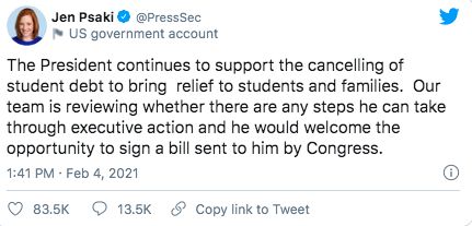参议院多数党领袖查克·舒默(Chuck Schumer)、马塞诸塞州参议员伊丽莎白·沃伦(Elizabeth Warren)、纽约州众议员蒙代尔·琼斯(Mondaire Jones)、马萨诸塞州众议员艾安娜·普莱斯利(Ayanna Pressley)、明尼苏达州众议员伊尔汗·奥马尔(Ilhan Omar)和北卡罗来纳州的阿尔玛·亚当斯(Alma Adams)在新闻发布会上提出了这项决议。进步派民主党联盟认为,1965年的《高等教育法案》(Higher Education Act)赋予白宫无需国会行动就可取消债务的权力。