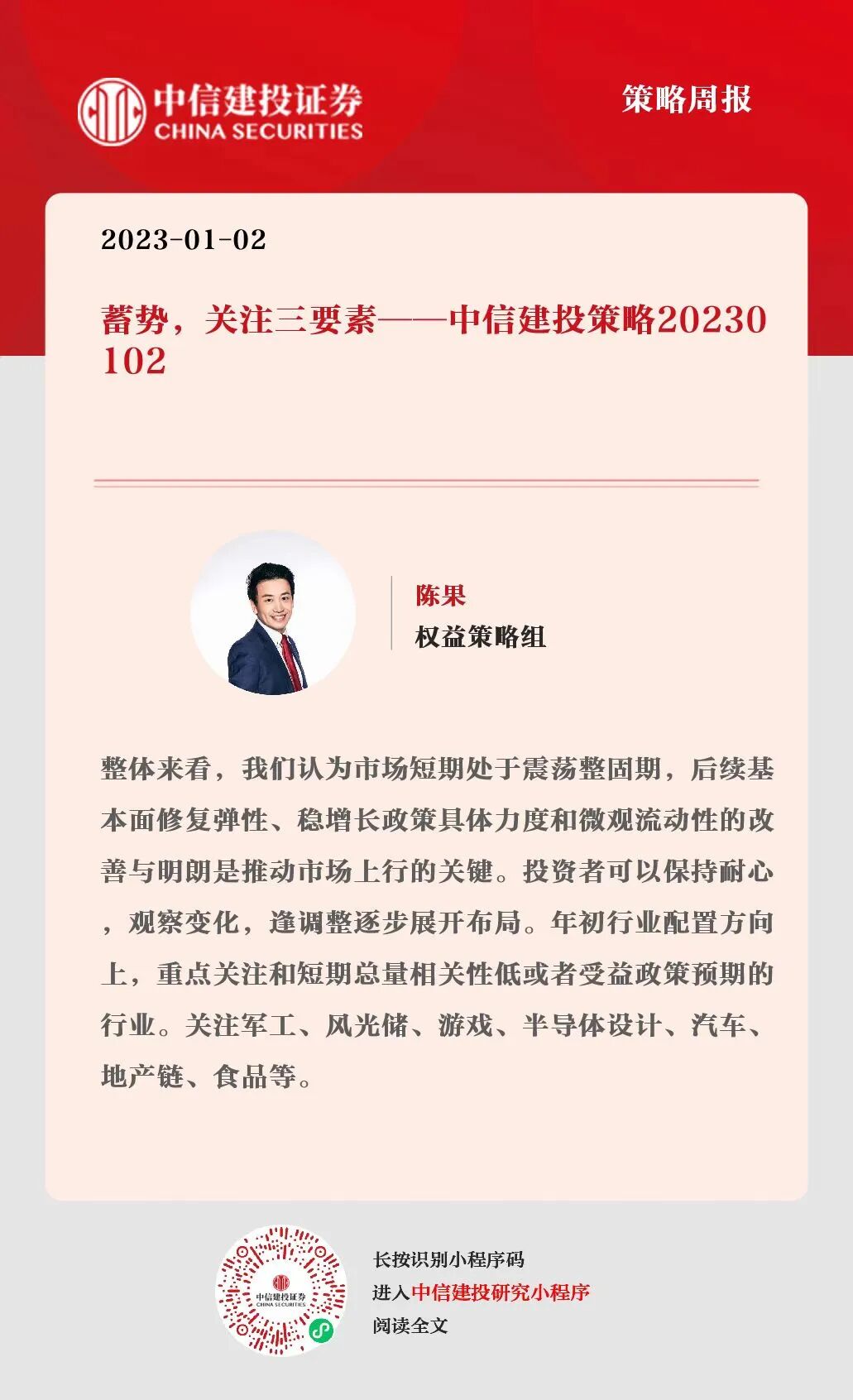 本订阅号不是中信建投研究报告的发布平台,所载内容均来自于中信建投已正式发布的研究报告或对报告进行的跟踪与解读,订阅者若使用所载资料,有可能会因缺乏对完整报告的了解而对其中关键假设、评级、目标价等内容产生误解。提请订阅者参阅中信建投已发布的完整证券研究报告,仔细阅读其所附各项声明、信息披露事项及风险提示,关注相关的分析、预测能够成立的关键假设条件,关注投资评级和证券目标价格的预测时间周期,并准确理解投资评级的含义。