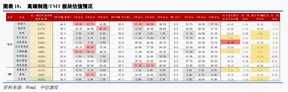 而另一方面,估值及交易热度渐回落至低位,而一季度存较多利好预期的科技成长板块则可逐步关注配置。当前整体经济环境偏低迷,12月制造业PMI处于三年以来低位水平,在经济基本面受疫情冲击,而尚未有有力新政策出台前,年度业绩预告超预期及低位利空出尽的高需求品种值得关注。近一个月以来,高端制造及TMT板块相对收益明显跑输,目前主要申万二级板块五日成交额占比及换手率(5MA)的五年分位数已回落普遍回落至65%以下合理分位,从估值水平看,光伏(含储能逆变器)/航空装备/风电/半导体PE(TTM)五年分位分别已达10%、36%、52%、3%的低位水平,而以产业周期视角看,光伏中下游、海风、储能、军工导弹链等仍处于需求稳定向上周期,未来两年需求复合增速有望维持30%+;半导体则有望在23年实现盈利周期反转。中期高景气需求支撑下,疫情、政策等部分因素仅改变短期盈利节奏,并不改中期向好预期,随下跌逐步反应如新能源装机不及预期担忧、军工交付担忧及美国对华制裁政策风险等,一季度相关风险点均有望得到实际性解决及改善,且在经济预期低迷环境下仍将凸显景气稀缺性,行情反弹可期。