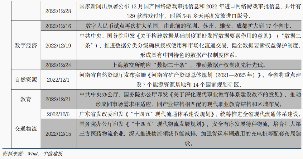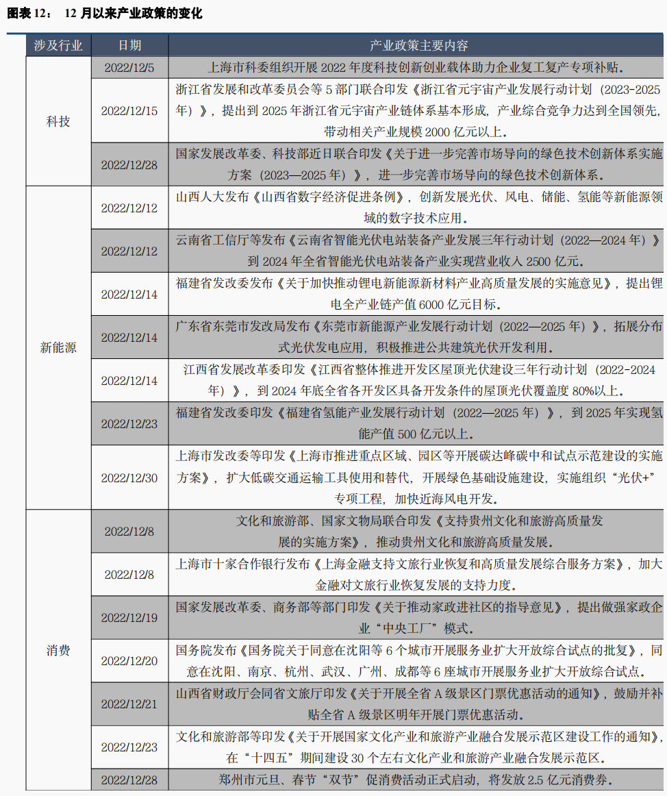 十二月以来产业政策频频超预期。近期中央及各地政府发布了大量支持性产业政策,内容涵盖科技、新能源、消费、数字经济、自然资源、教育、交通物流等众多行业。此外,12月15日至16日举行的中央经济工作会议也指向数字经济、新能源、绿色低碳、养老服务等领域在2023年有望迎来的利好政策。近期房地产方面少有增量政策,但密集出台的产业政策有望填补空白,助力疫后经济的短期复苏。