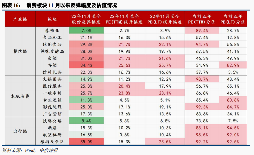 政策及预期驱动下,A股消费板块估值先行,相关申万二级行业指数11月以来股价及估值普遍反弹15%以上,目前多数板块估值高于19年同期、处于5年估值40%以上。随着估值率先修复而基本面验证短期仍具不确定性,第一轮预期驱动下的超额收益快速上行行情或将步入尾声,板块逐步转向基本面驱动交易。从目前高频指标恢复情况看,近期表现相对较佳的板块包括食品(C端受益疫情囤货需求,B端受益餐饮修复预期提振)、免税(海南旅游旺季到来,三亚航班同比降幅迅速收窄)、医美(新氧使用时长明显提升)。