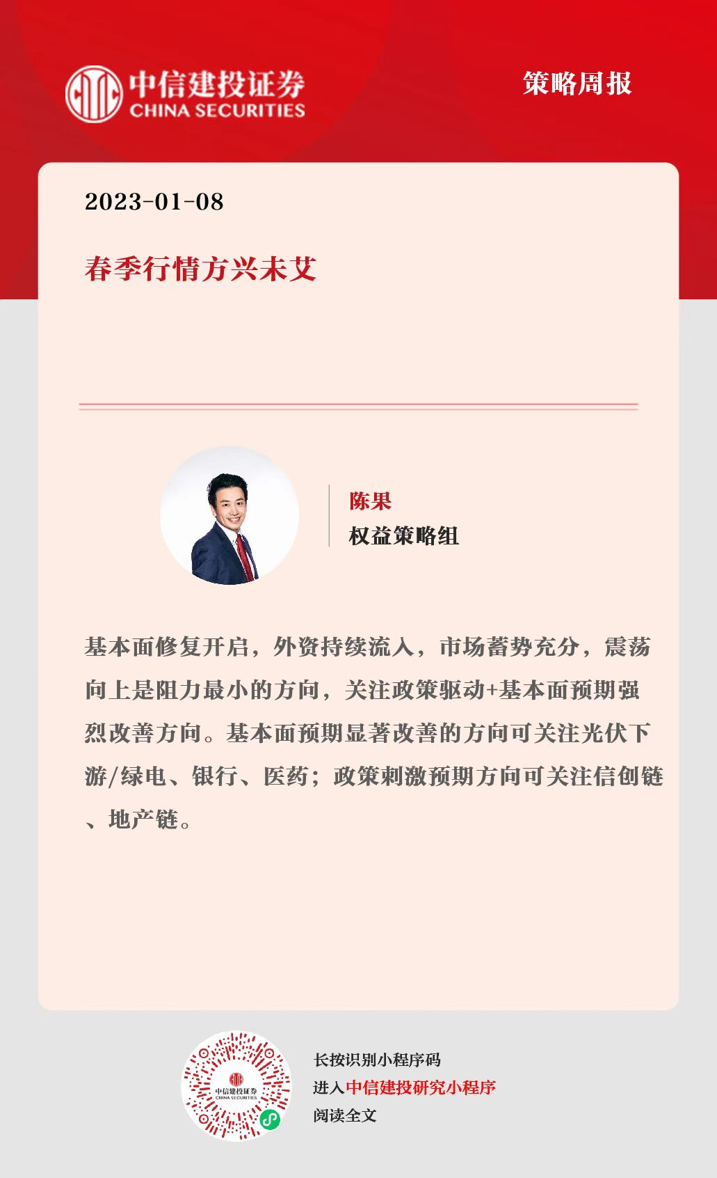 按行业周期、政策预期和经济预期三大线索寻找23年一季度关注方向,基本面预期显著改善的细分推荐关注光伏下游/绿电、银行、医药;政策刺激预期方向推荐关注信创链、地产链。考虑到以产业周期视角看,光伏、储能及信创等成长板块兼具远期成长性及短期景气度,整体确定性优于政策预期驱动下的地产链板块。