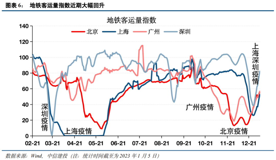 本轮疫情冲击,最大的超预期在于疫情发展的速度、“阳达峰”的时间和疫后修复的进度明显快于此前历史经验和人们的预期。在12月下旬基本确立了疫情传播的顶峰和基本面的最低点,我们一直跟踪的高频数据指标如35城拥堵延时指数、地图客运量指数和全国整车货运流量指数,能够从交通、物流的角度对疫情冲击和基本面修复情况进行及时的跟踪。数据显示全国疫情在去年12月23至31日达到顶峰,进入2023年后,全国人流物流均获得大幅回升,疫情冲击过去,基本面修复开启早于此前预期。