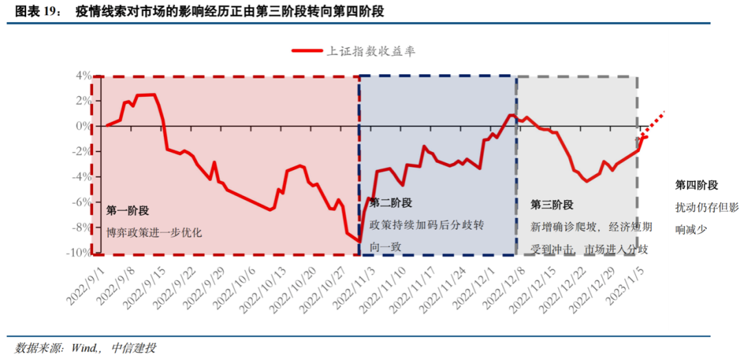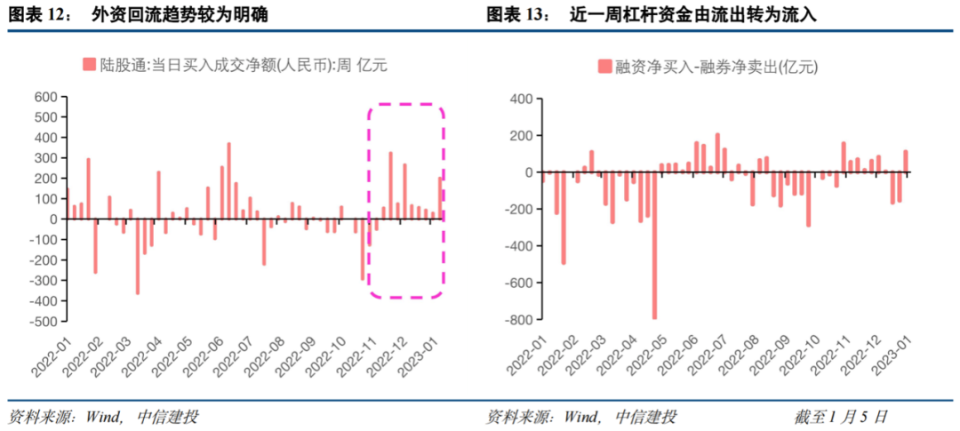 基本面修复正在开启,市场前期担忧出现改善。我们在上周周报中提示关注三大因素的边际改善,本周均得到响应。第一,疫后复苏是市场近来持续关注的最核心矛盾,而其先决条件就是人流量和消费场景的恢复(新冠感染人数达峰),本周越来越多的地区已经率先迎来“阳达峰”并出现线下消费复苏迹象。第二,稳增长政策的具体落地力度开始得到验证,地产政策再度迎来加码以及部分政府官员有关房地产问题的积极表态,正是对中央经济工作会议所提及的作为稳增长核心抓手之一的“住房消费”的积极响应。第三,跨年资金面的紧张也已得到缓解,DR001与DR007利率再度回到年前低位,均创下去年9月以来新低。