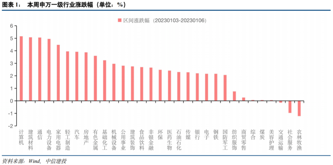 本周市场呈现普涨格局,投资者情绪明显回暖。元旦节后首周,投资者交易情绪迎来回暖,北向资金大幅净买入,市场日均成交额逐步回升,各主要指数全线上涨。代表小盘股的国证2000指数全周领涨,涨幅3.63%,偏科技成长风格的科创50与创业板指紧随其后,分别上涨3.25%和3.21%;其余各主要指数方面,上证50、沪深300和上证指数分别上涨2.97%、2.82%和2.21%。市场风格维度,成长相对占优,国证成长指数上涨3.23%,国证价值指数收涨2.29%。行业层面,本周31个申万一级行业仅3个行业微跌,沉寂数周的数字经济相关板块再度活跃,计算机、建筑材料、通信板块涨幅居前,分别上涨5.15%、5.08%和5.05%;农林牧渔、社会服务与交通运输板块跌幅居前,分别下跌1.22%、0.96%和0.15%。