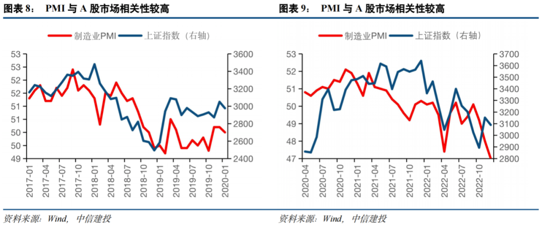 经济基本面趋势与市场风险偏好相关度较高,PMI短期底部或已出现。12月防疫政策再度优化,全国各地陆续迎来感染高峰,疫情冲击下的PMI数据继续下探,呈现出供需双弱的特点。后续随着冲击高峰的过去及稳增长政策的逐步落地,PMI的短期底部大概率已经出现,有望开启新的一轮上升趋势。而历史经验表明,以PMI表征的宏观经济基本面趋势变化与市场风险偏好存在明显的相关性,且中美市场都是如此,经济周期的运行对企业盈利周期的影响一定会映射到资产价格层面,映射背后的一条重要传导路径就是通过改变市场参与者的风险偏好。其结果是,当中国PMI低位时的单月低点,往往也是A股市场的阶段性底部。为了更加直观和显著地展现两者相关性,我们剔除了2020年疫情当月PMI数据极端值的影响(PMI的波动区间小),并且分别选取了中美两国各自更具代表性的产业(中国制造业PMI和美国服务业PMI)。