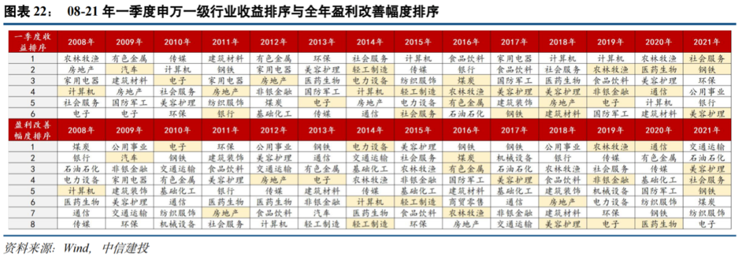 两因素驱动下,市场在此阶段对于全年基本面预期改善方向及可能的政策催化关注度明显提升。我们统计了08-21年一季度各行业收益排序及全年行业盈利改善幅度排序情况,可发现自14年以来,一季度收益靠前的板块与全年盈利改善幅度居前板块的重合度较高且较前期明显提升,收益居前的6大板块中,2~3个板块的盈利改善幅度在全年排前8(前25%)。而另一方面,对于政策预期的炒作特征也较明显,如16-17年供改催化下周期板块表现居前,19年贸易战环境下自主可控概念崛起。