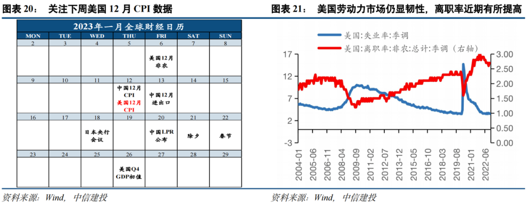 海外方面:1)对美联储货币政策的预期变动和多项经济数据的发布或成为短期扰动市场的主要诱因,需注意美股波动性持续给市场带来的风险。2)将于下周公布的美国12月CPI数据或成为美联储未来货币政策的重要考量点。3)注意美国其它经济数据和相关经济事件的超预期风险。1月6日公布的美国12月非农就业数据略超预期,失业率3.5%,预期3.7%,前值3.7%。其中,美国12月非农就业人口增加22.3万人,有所放缓。就业数据仍显韧性,但平均时薪增速已显著下降,创2021年8月以来的新低。面对工资通胀的降温,市场预期美联储的紧缩政策或有所缓解。