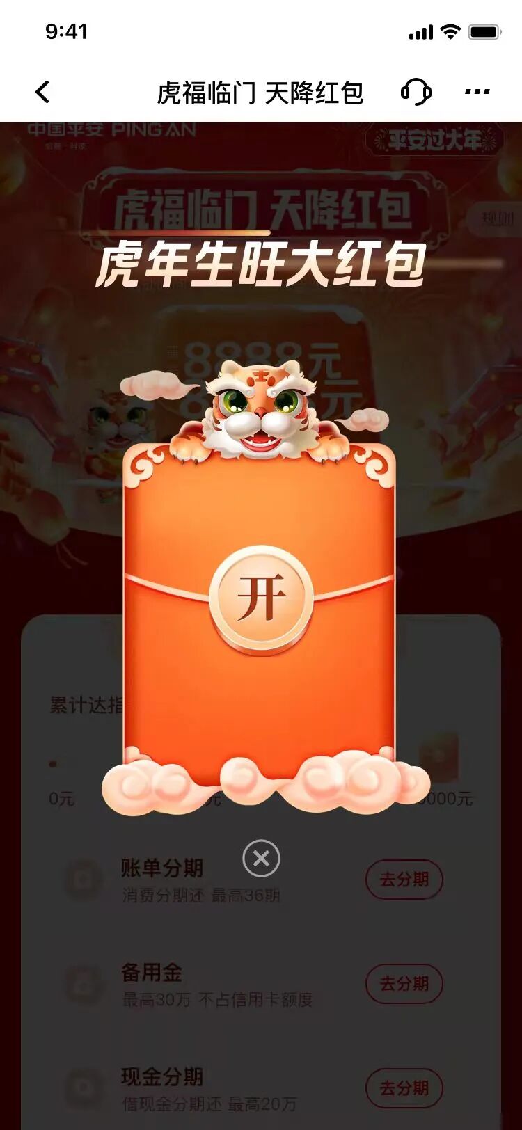看到这里,决定分期的朋友们不要急着操作!因为又有回血福利了!平安信用卡推出了分期超级回血活动——虎福临门、天降红包!抽奖最高可得8888元免单现金红包!