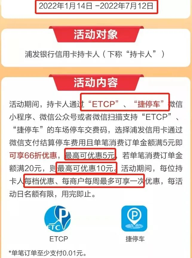 66停车:2022年1月14日-2022年7月12日,上海、江苏省、浙江省、安徽省所涉及商圈停车场,通过“ETCP”、“捷停车”微信小程序、微信公众号或微信扫描支持“ETCP”、“捷停车”的车场停车交费码,选浦发信用卡微信支付,单笔消费满5元享66折,最高优惠5元。单笔消费满20元最高优惠10元。每人、每档、每商户、每周享一次,每日名额有限。