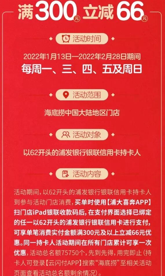 海底捞:2022年1月13日-2022年2月28日(每周一、三、四、五及周日),上海、江苏省、浙江省、安徽省、北京市、广州市、天津市、重庆市所涉及海底捞门店,银联62卡、在海底捞活动门店、用浦大喜奔APP扫商户门店银联付款码支付、单笔消费实付300元及以上、立减66元。期间每人限1次立减,共75750名额,先到先得。
