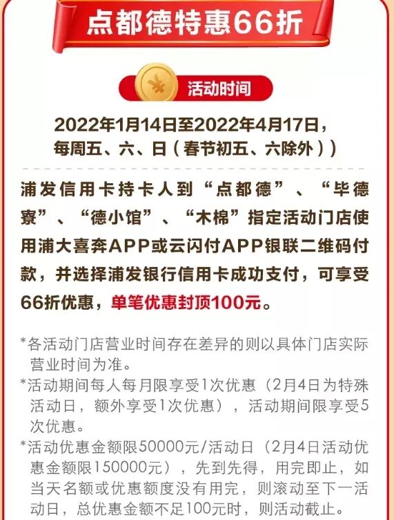 点都德:2022年1月14日—2022年4月17日,每周五、六、日(春节初五、六除外),上海、重庆、广州、深圳的“点都德”、“毕德寮”、“德小馆”、“木棉”指定门店、用浦大喜奔APP或云闪付APP银联付款码、选浦发银行信用卡支付、享66折,单笔最多减100元。每人每月限享1次(2月4日额外享一次)。每活动日优惠金额限50000元(2月4日为150000元),先到先得。