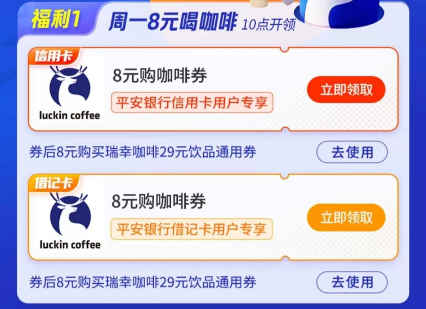 截止到2022年12月31日,平安银行信用卡、借记卡用户每周一10点起,可在【平安口袋银行APP】,免费领取满29-21元瑞幸咖啡立减券。