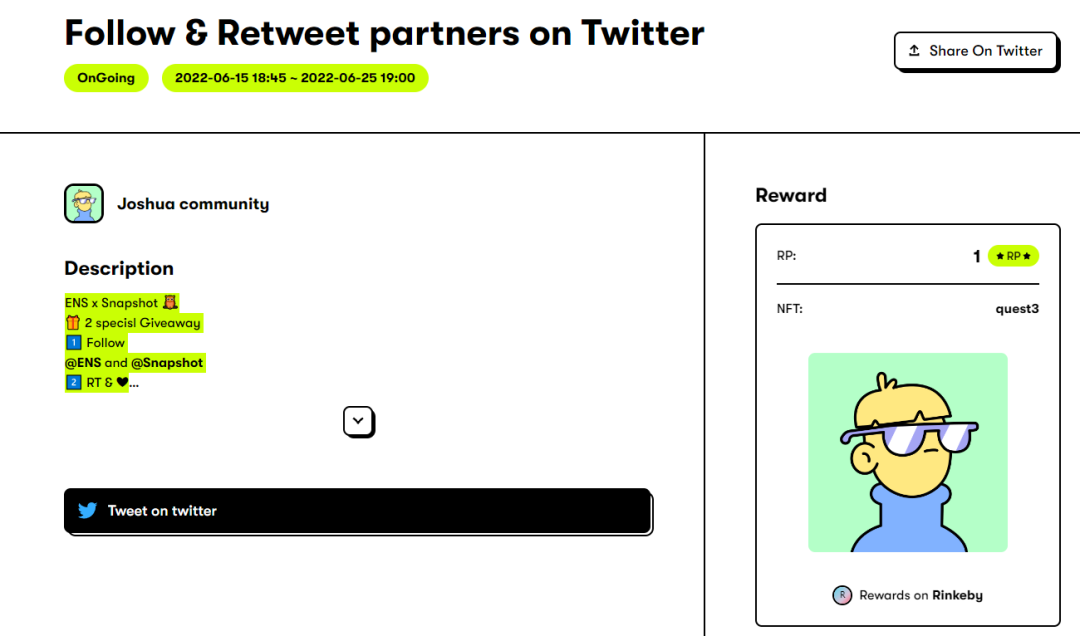 用户能看到哪些任务和活动,实际上依赖于事先进行的任务设计;因此“肝任务”的繁琐程度,很大程度上取决于任务设计形式。围绕着任务发布和任务领取,Quest3的产品被分为了B端和C端。我们可以先从B端来看看产品特点。对于B端产品,从设计逻辑上来说,我们关心的重点其实是:谁可以发布任务?可以发布什么样的任务?在“谁可以发布任务”这个问题上,一个先入为主的答案必然是“项目方”。在常用的兔子洞和Project Galaxy等平台上,时常可以看到项目方们发布的任务,如学习一次Defi的交互,或是参与一次讲座活动等。但想要在这些平台上发布任务是需要门槛的,事先需要填写申请表并等待平台审核。这种先验证后发布的设计,可以筛选大项目,但也将其他人拦在了门外。除了大项目,整个Web3中小到独立的个体,大到KOL、社区和DAO,他们在自己有限的能力边界内,都需要去影响他人并进行推广。而Quest3在门槛设计上更为开放。在B端版本中,任何人都可以无门槛地发布任务。这也就意味着,仅需一个钱包即可连接到Quest3的B端。随后在创建社区的选项中,填写社区名字和域名即可进行后续任务发布的操作。用户不会无条件地相信项目资料的真实性。为了增加可信度,你可以为所创建的项目或社区绑定更多的社交账号。更为重要的是,在发布任务时往往涉及到用户完成任务之后的奖励。Quest3会要求你发布正式的任务之前,将指定的通证存入Vault(金库),以便后续用户完成任务之后能够领取奖励。这是种有条件“验资”设计,用以判断你是否有能力满足声称的任务奖励。对于大的项目方,他们自然可以发布更大金额的任务奖励;而对于长尾的KOL、小组织和DAO,他们也可以在自己的能力范围内去发布任务奖励。一个可以预见的效果是,大项目会成为标杆,吸引大量用户进入Quest3做任务;而用户量增加之后,平台上的中小型组织,发布的营销任务也会逐渐被用户看到。这将有利于抓住长尾市场的宣传需求,而这也是目前市面上大多数任务平台所不具备的设计。在降低了发布任务的门槛后,Quest3同样对发布任务的形式和效率进行了优化。整个Web3中的任务实际上就2种:链下的和链上的。前者大部分是对项目社交媒体账号的关注和点赞等,后者则涉及到链上的交互、加密资产的存入以及快照等。而目前对应的常见做法是,链下任务通过其他的营销工具来检查用户是否完成,链上任务则需要检查用户的地址是否产生了相关的交互行为。这也是用户觉得“肝任务”麻烦的原因之一:一个项目的活动,需要跑不同的地方做检查和验证,相对费时费力。链上交互行为有钱包的地址、交易和交互记录做支撑,可以自动对完成结果进行识别;对于链下推特和Discord等社媒相关任务,Quest3能够自动验证用户的关注或者点赞行为是否完成,而无需再去借助别的工具来检查用户是否完成了任务。同时这也意味着,营销人员不必再人工的核对钱包地址和奖励发放是否匹配,对B端的营销效率无疑是一种极大的提升。![]()