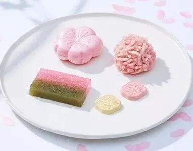 4 月的樱吹雪、5 月的紫阳花,和果子的配色常常随着季节更迭来进行创作。受到和果子色彩启发,资生堂在 2018 年 2 月推出了和果子配色风格的彩妆系列 PICO。PICO系列体量小、价格适中,再加上和果子包装风格的小型纸袋,PICO瞄准了喜欢在化妆上追求个性的年轻人,也希望成为受欢迎的小礼物选择。这样的定位也与虎屋一拍即合。虎屋与资生堂 PICO 系列推出联名 POP-UP 商铺,在彩妆专柜旁开出期间限定的和果子茶屋,推出的和果子套餐颜色和 PICO 推出的彩妆色彩相呼应。PICO 网站上也定期更新和虎屋的联名妆容,用和果子色的眼影再现虎屋应季商品的配色。