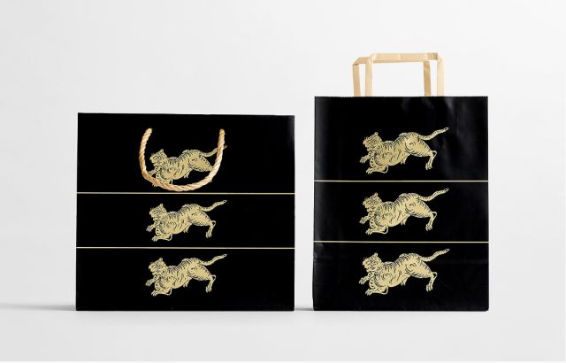 △ 葛西熏为虎屋设计的手提袋,造型参考了虎屋18世纪所使用过的虎纹多层食品盒,通过让老虎图案向上扬起5度角来展现跃动感。 图片来源|sun-ad