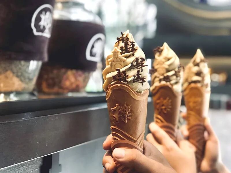 提起宫原眼科,汪恬立刻想到“冰淇淋很好吃”。“冰淇淋口味超级多,巧克力味就超级多种,”汪恬说,“一个浅纸杯,放一块华夫饼,可以加料,插蛋糕也可以插凤梨酥,都是日出自家的产品。”
