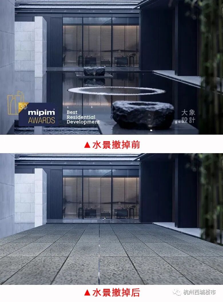 针对园区内部分水景,绿城开发商在宣传广告上以及绿城官方公众号内明确标明为小区项目实景图,但是现在开放商说园区内部分水景都必须撤离,那么水景要拆除的为什么还要展示出来宣传呢?我们有很多人都是看上了园区水景这个卖点,才决定购买的,而且宣传时园区内地面为石材,但是事实上为瓷砖。还有在小区正大门设计,一开始是方方正正的,但是现实确实斜口的。有很多地方都是和宣传时都有很大的差距,开发商宣传与实际交付效果出入较大。