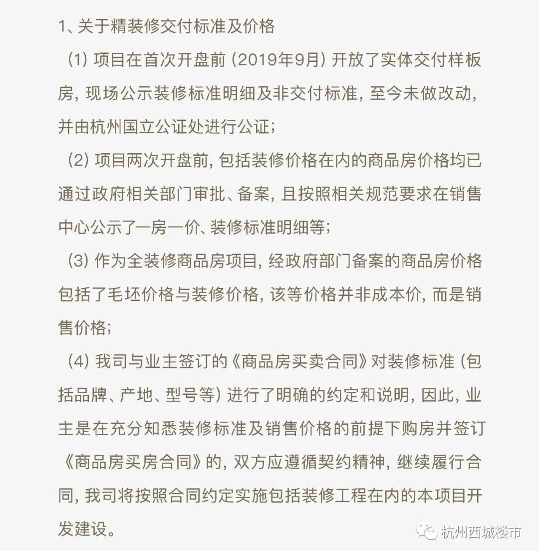 2020年01月10日杭州市房管局发布的杭房局〔2020〕6号《关于加强全装修交付商品住宅项目管理的通知 》规定交付样板房装修所用主要材料、设施设备应与商品房销售合同的约定一致,并在交付样板房内公示清单明细;商品房销售合同约定以外的装修材料、设施设备等,应予以区分明示。而项目开发商在接到房管局的正式整改文件后,仍执意不整改。