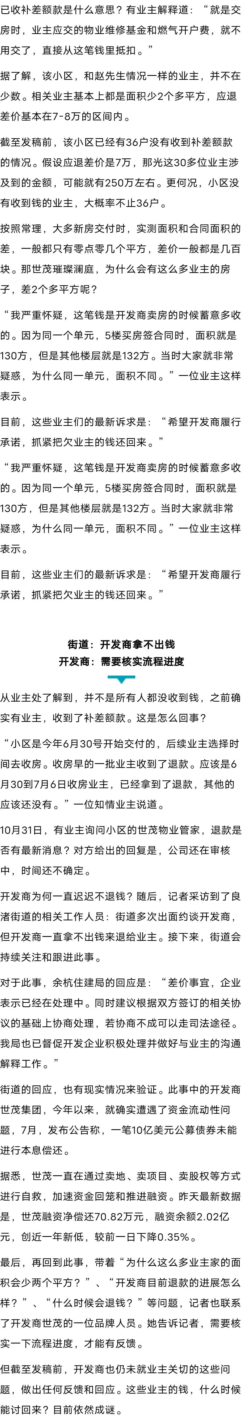 这事是个别情况,还是相对普遍现象?为什么交房时面积会少2个平方?开发商又为什么迟迟不退钱?什么时候会退钱?带着这些疑问,记者对此事进行了了解。世茂璀璨澜庭的赵先生(化姓),给了一份项目收房时的付款通知。“我是8月份收房的,当时就给了这个通知,说是9月份给我打款,结果现在也没收到钱。”赵先生说道。在这份付款通知上,可以清楚看到,合同约定的建筑面积是133.53方,交付时实测可售的建筑面积是131.03方,补差面积是2.5方,合计应补退价82722.55元,已收补差额款是8611.80元,最后实际要补业主的钱是74110.75元。![]()