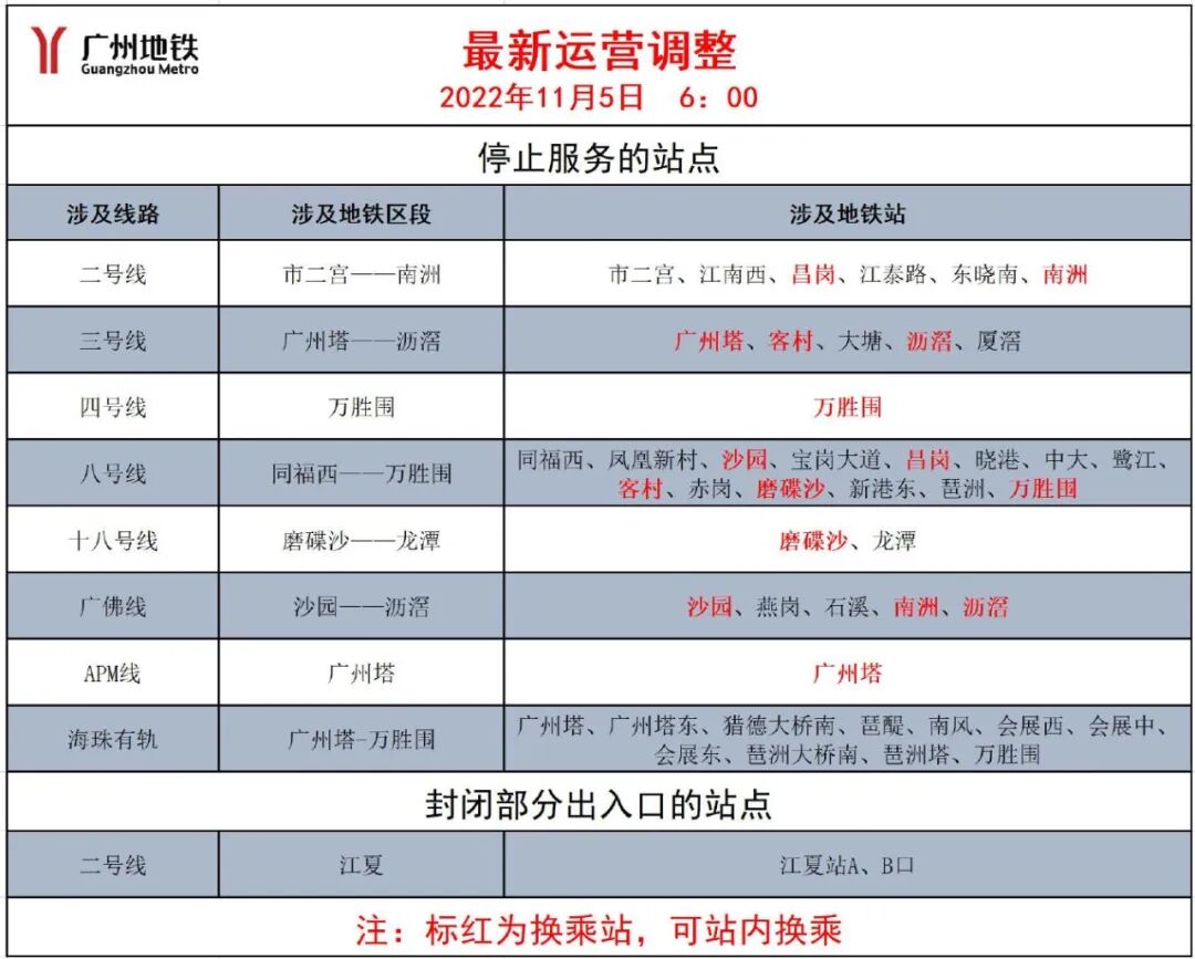 地铁:11月5日运营时间起,广州地铁二、三、四、八、十八、广佛线、APM线涉及海珠区内的所有地铁车站和有轨电车均停止对外服务,其中涉及的换乘站保留站内换乘功能。期间,为保障成人高考等考试考生需要,11月5日、6日上午6时至9时海珠区内站点正常服务,客村站、大塘站、龙潭站维持原来的停止对外服务(客村站可换乘)。