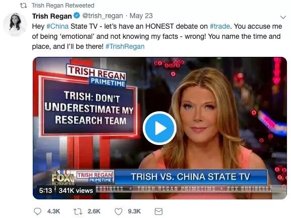 5月14日,福克斯商业频道(Fox Business)女主播翠西•里根(Trish Regan)在每天黄金时段播出的 Trish Regan Primetime 节目中,宣扬对华“经济战”的言论,称中美贸易不平衡是美国“必须用在中国身上的武器”。