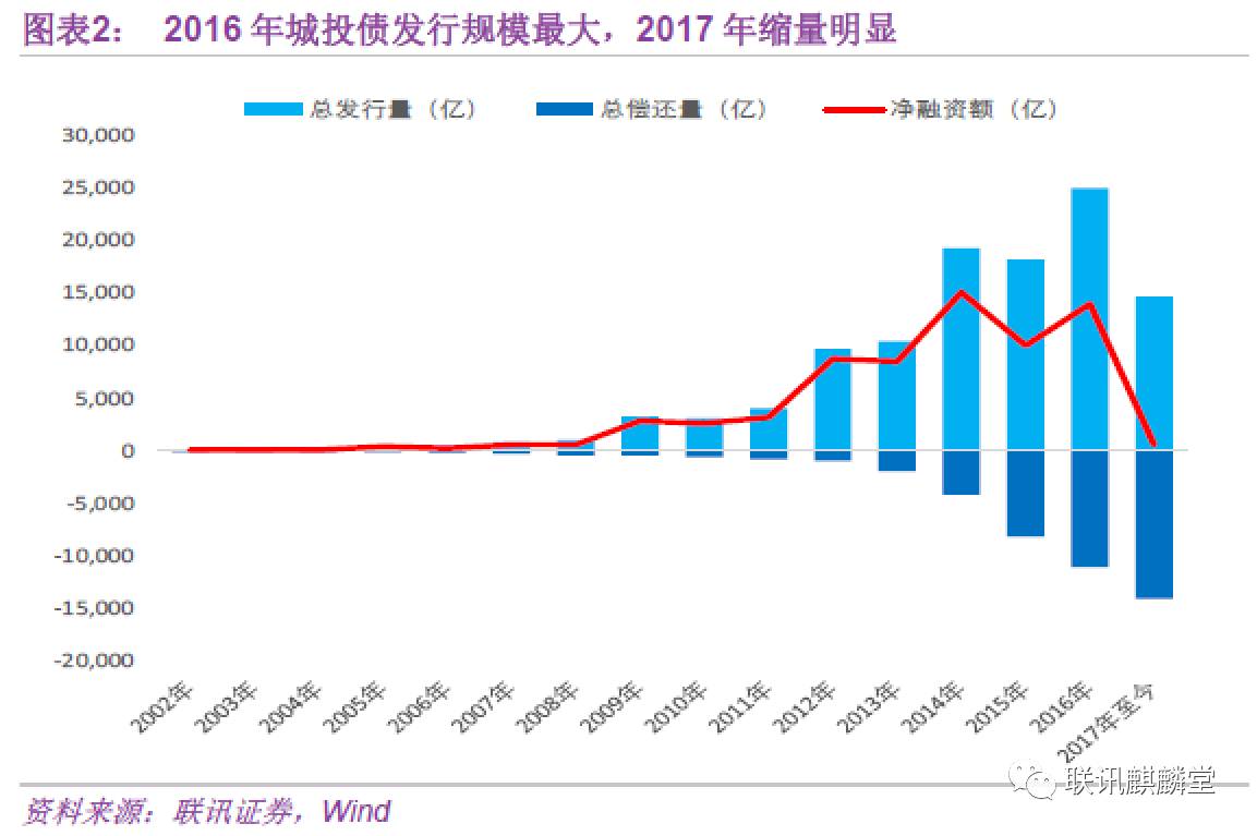 从所发债券类型看,主要包括企业债、公司债、短融、中票和定向工具。2017年新发行的1.46万亿城投债中,五者的占比分别为18.6%、17.0%、22.1%、25.9%和16.3%。