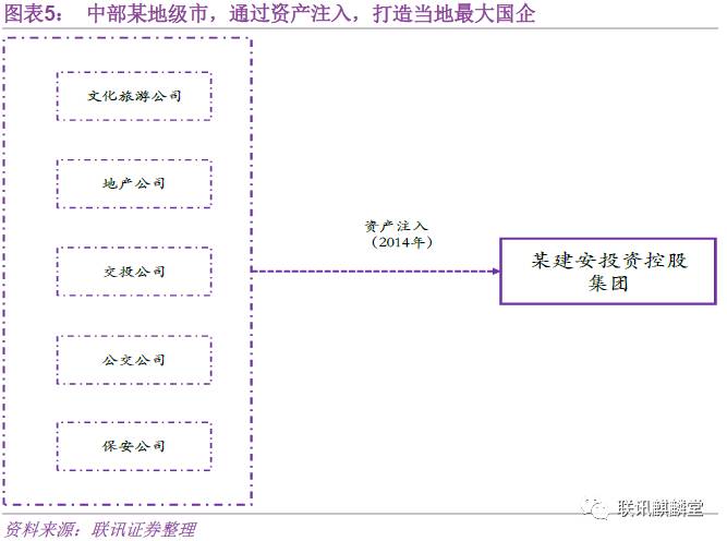 另一个例子是西南某自治区某地级市所属的投资控股有限公司。2001年该公司成立,成立当月该市国资委就将当地的某城市建设发展有限公司、某建设投资开发有限责任公司、某房地产开发有限公司这三家城投公司,以及某自来水公司的股权划拨至新成立的投资控股有限公司。2003年,当地国资委又将某投资发展有限公司注入该公司。该公司不从事具体业务,主要负责国有股权管理,但子公司覆盖了当地的基础设施、医院、公园、房地产、保障房等项目的建设和投融资工作。