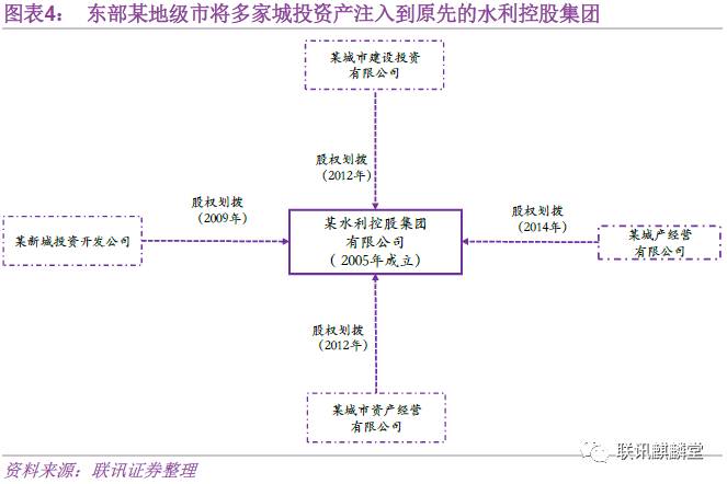 一个是东部某地级市水利控股集团有限公司。该公司成立于2005年,主要负责当地的水利工程建设。2009年当地国资委将某新城投资开发公司划拨至该公司,2012年当地国资委又将某城市建设投资有限公司、某城市资产经营有限公司划拨至该公司,2014年再次将某城产经营有限公司无偿注入到该公司。通过以大并小,该公司业务覆盖了当地主要城区的土地开发及基础设施建设等。