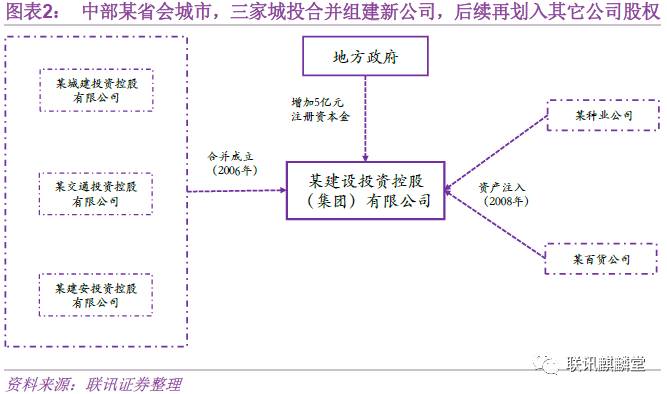 我们来看看中部某省会城市的案例。2006年,该省会城市将其所管理的城建投资控股公司、交通投资控股公司、建设投资控股公司合并,组建新的建设投资控股(集团)有限公司,政府向新公司增资5亿元作为资本金。新公司业务覆盖了当地的交通、电力、天然气、水务、市政项目。2008年,地方政府又通过股权划拨的方式,将某种业、某百货公司的部分股权注入到该公司。