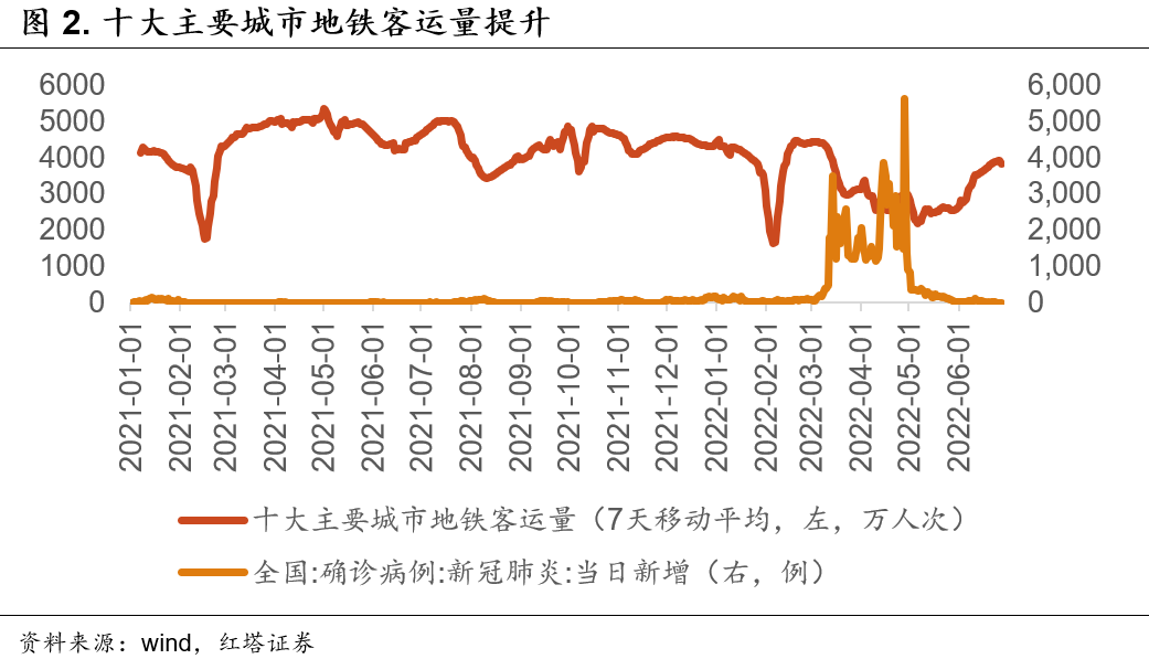 随着6月本轮疫情进入尾声,居民出行逐渐恢复正常,线下消费场景也开始加速修复,比如我们能够看到国内主要城市地铁客运量持续回升等。