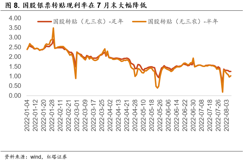 从下图中可以看到7月末半年期的国股银票转贴现利率下行至0.2%。相应的,我们能看到7月票据融资新增3136亿元,同比多增1365亿元,环比多增2340亿元。