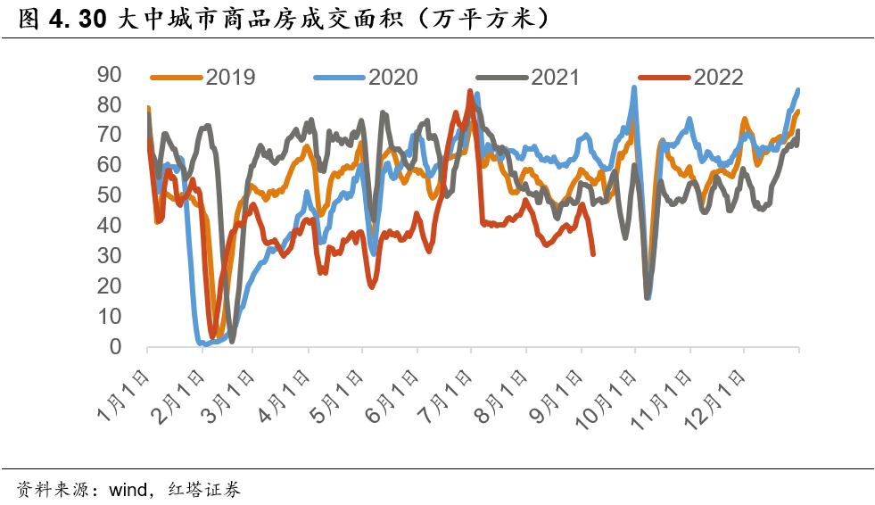中长期贷款同比增量依旧为负。一是反映出按揭贷款利率相比于居民理财收益率仍高,叠加不确定预期下超额储蓄的需求,提前还贷的购房者居多。二是反映出居民的购房意愿仍较低,居民资产负债表和预期受损,导致大部分城市的房价目前尚未企稳回升,而且房企信用风险还未消除,居民更多还是选择先持币观望。8月以来30大中城市商品房销售面积依旧不乐观。