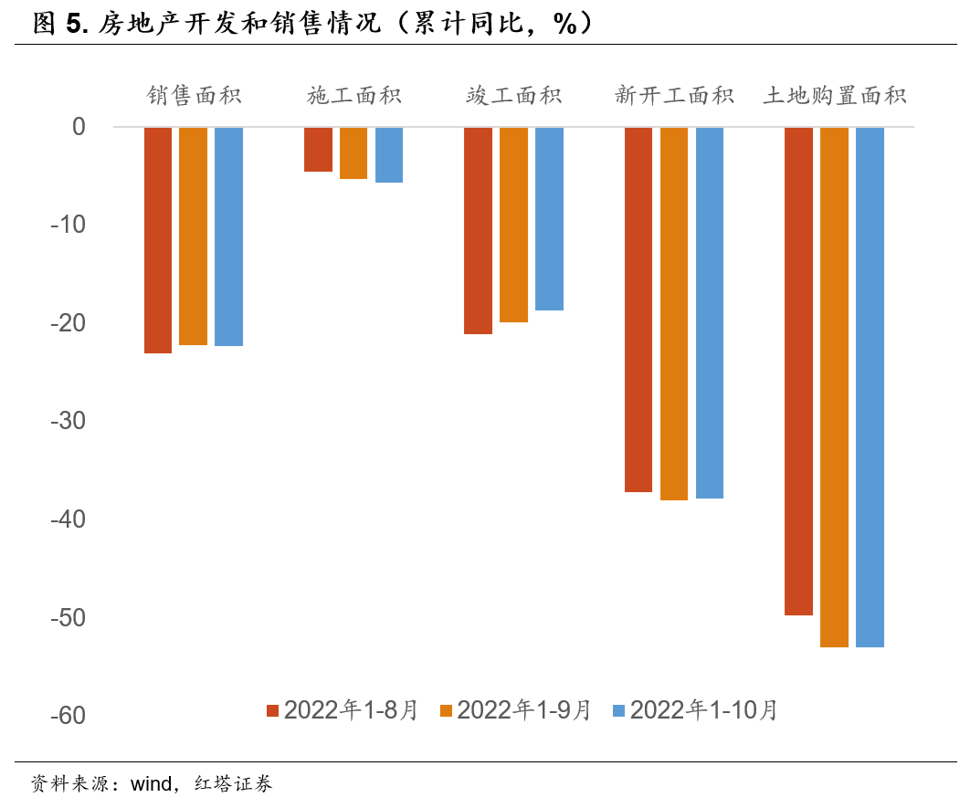 10月房地产开发投资累计同比下滑8.8%,前值8.0%;倒推法计算下当月同比增速为16.0%,较前值下滑3.9个百分点。结构上,施工面积、竣工面积、新开工面积和土地购置面积累计同比增速分别为-5.7%、-18.7%、-37.8%和-53.0%。