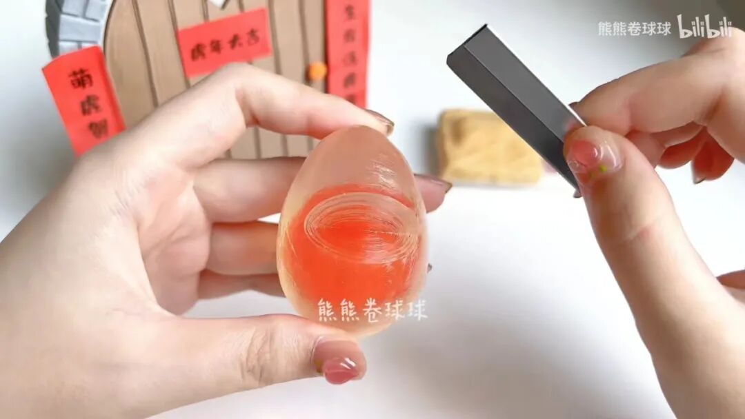 对后期剪辑,熊熊也是精益求精,必须剪到最舒适、最满意才会发布出来。除了最基本的实心胶带球,熊熊也会想各种创意,比如在《喷射卡比》的视频里,她将任天堂游戏“星之卡比”的形象做成了胶带球,切开后里面喷出了五彩斑斓的水宝宝。