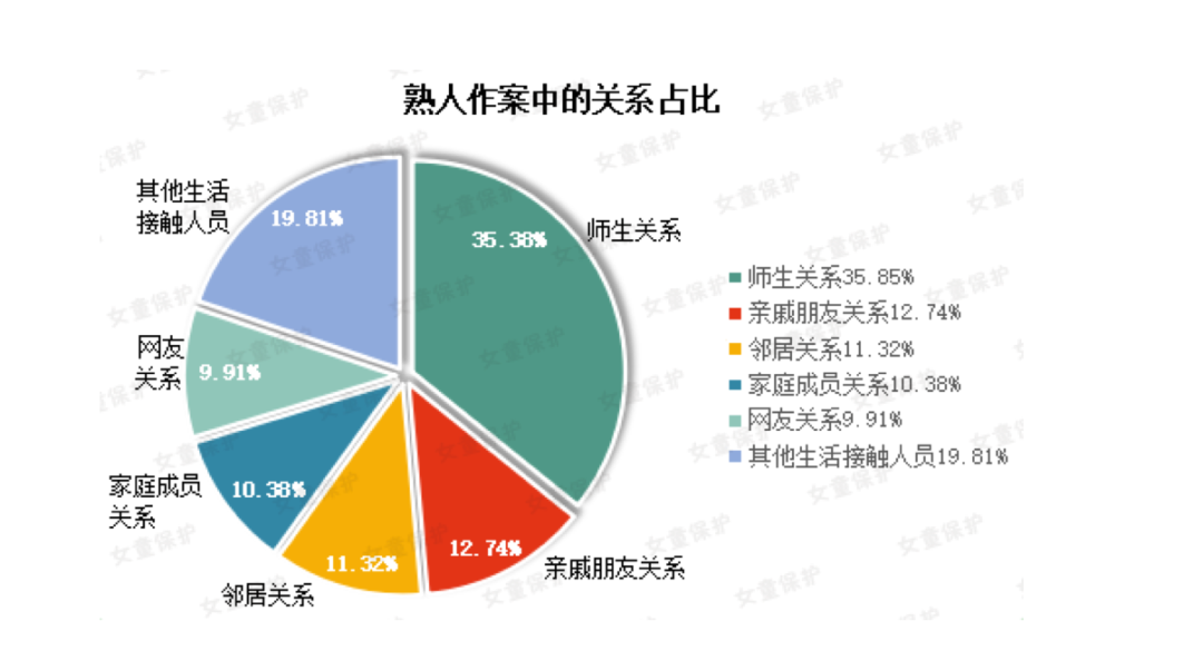 根据“女童保护”的这份报告数据,熟人作案中的关系包括:师生关系(含培训⽼师)、亲戚朋友关系(含父母朋友)、邻居关系(含同村人)、家庭成员关系、网友关系,以及其他生活接触人员。