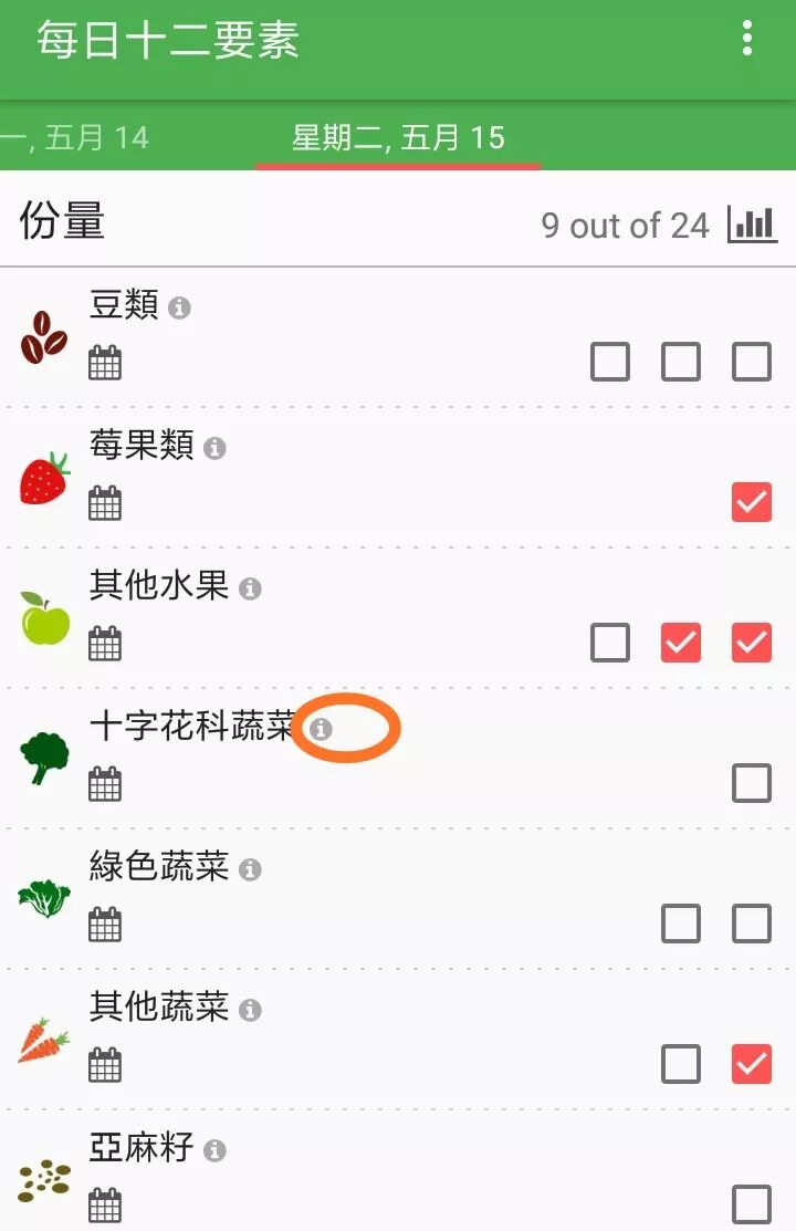 如果不知道那些食物属于某些分类,就可以点击那个圆圈里的“i" 字,“i" 就是 information (更多信息)的意思。![]()