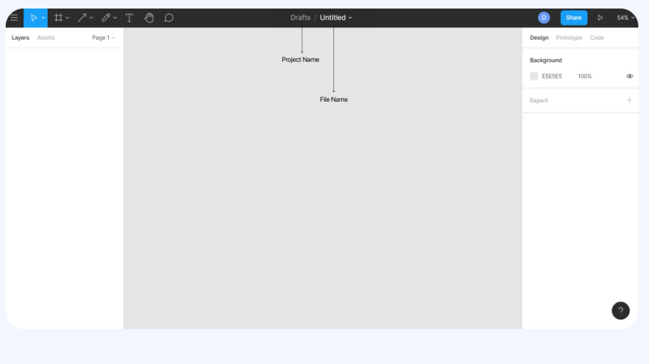 一旦你选择创建一个新文件,你就会进入一个看起来非常简单的编辑器,所以如果你从任何 UI 设计工具切换到 Figma,你不会不知所措。工具栏为您提供了许多选项:例如菜单、移动和缩放选项、框架工具、形状工具、钢笔工具、文字工具、手工具、评论工具、个人资料头像、分享按钮和播放和缩放按钮。